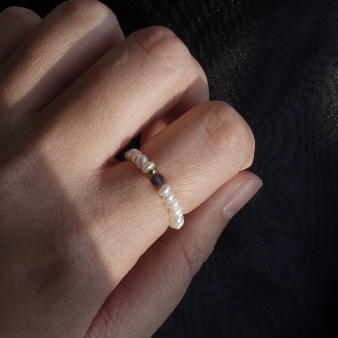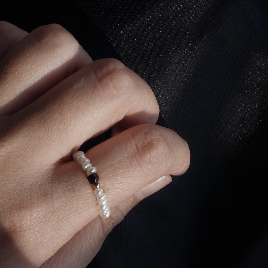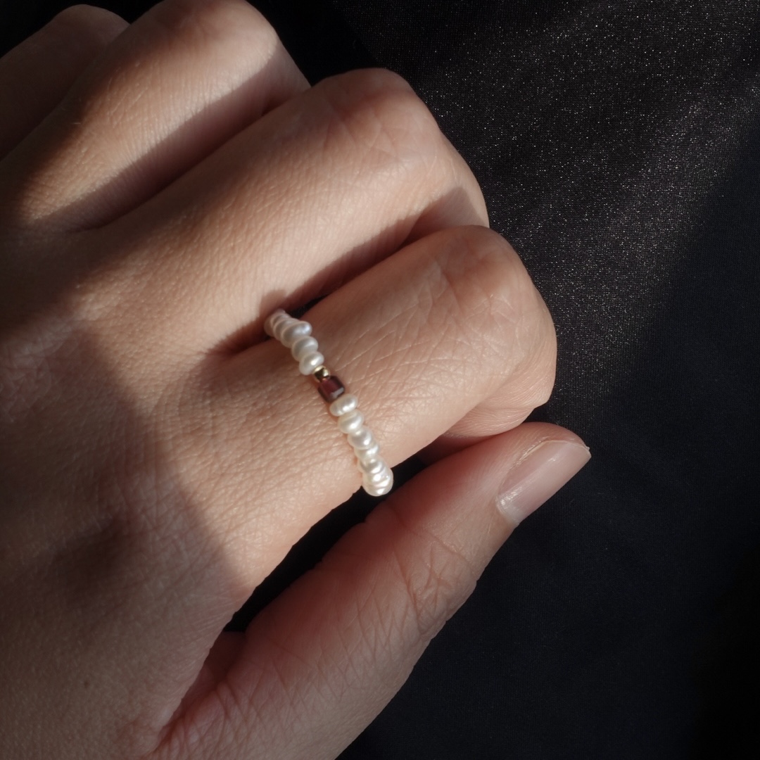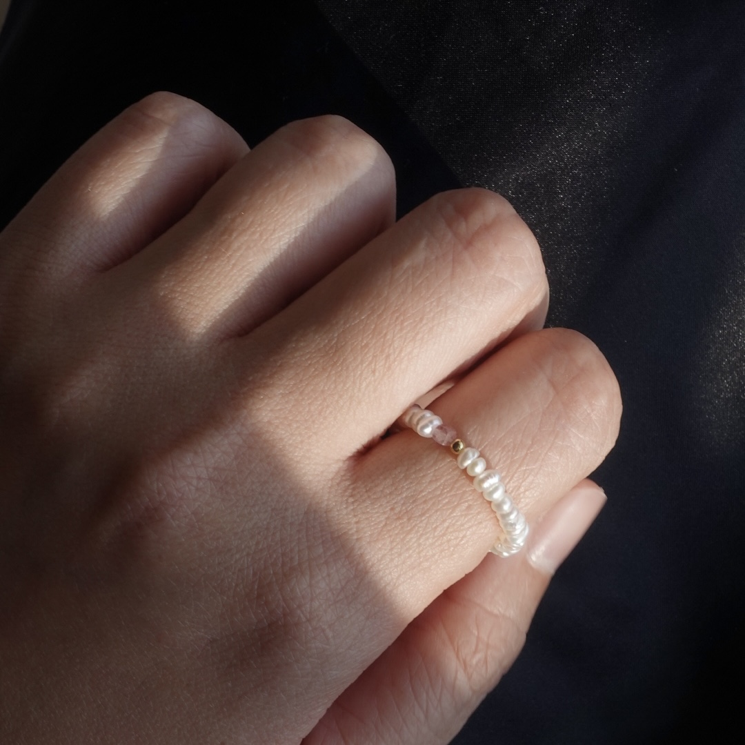 細扁珍珠 方塊天然石彈性珠戒 14KGF