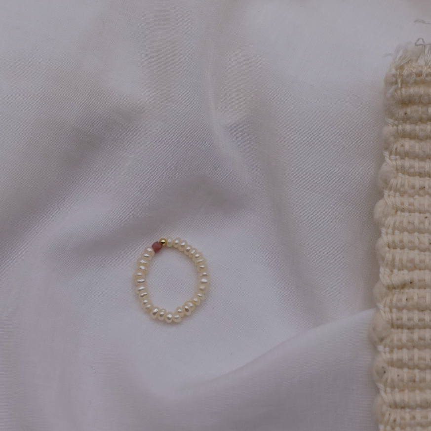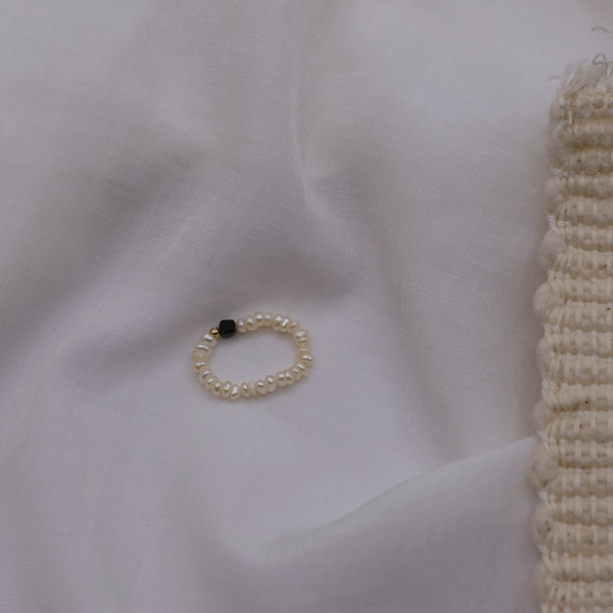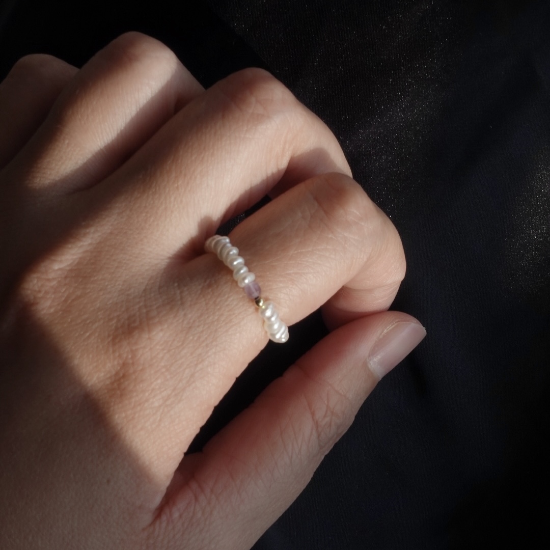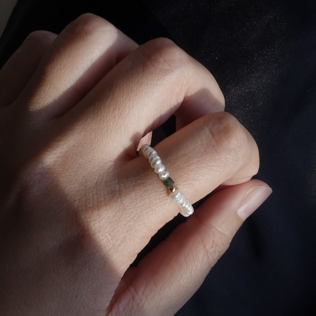 細扁珍珠 方塊天然石彈性珠戒 14KGF